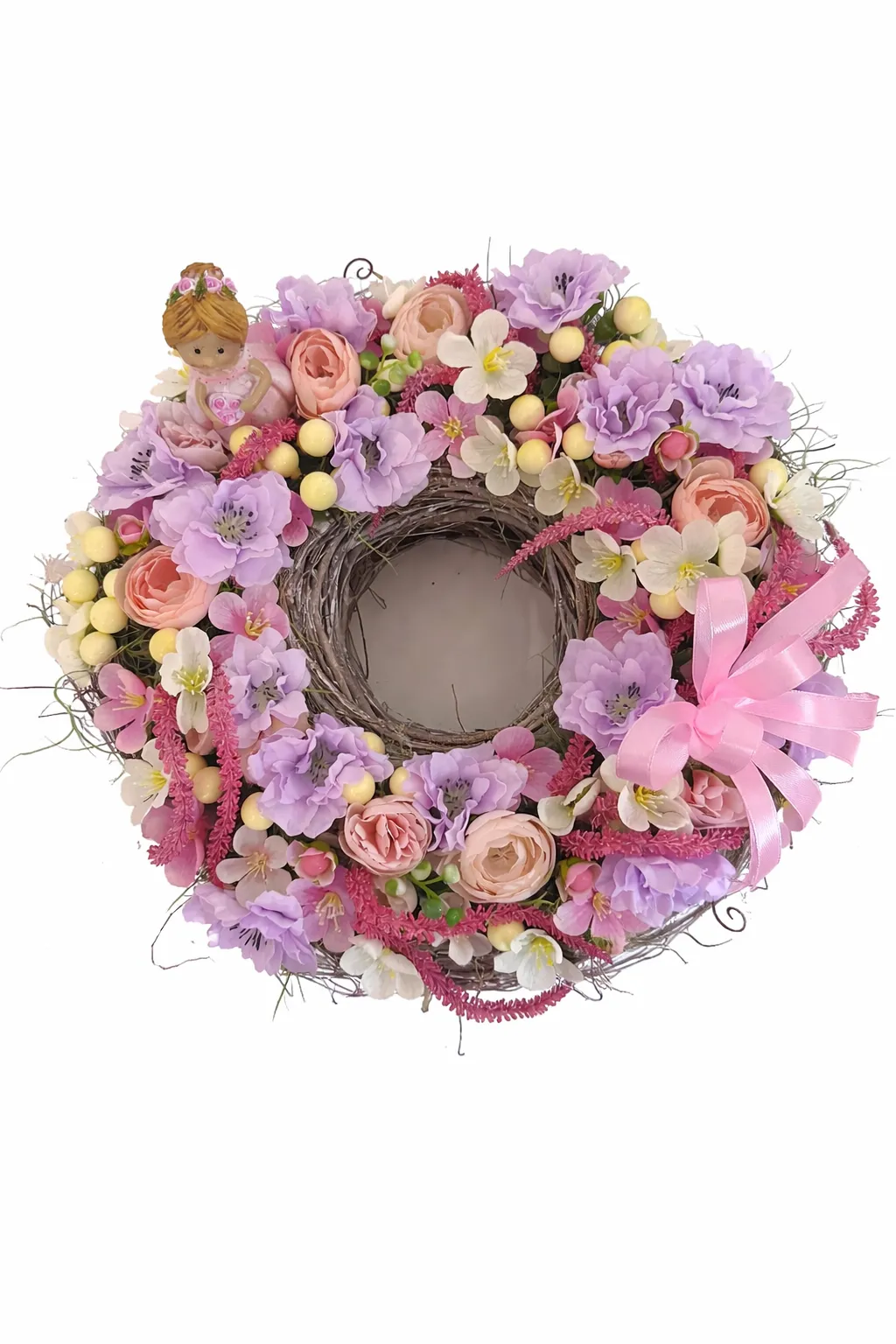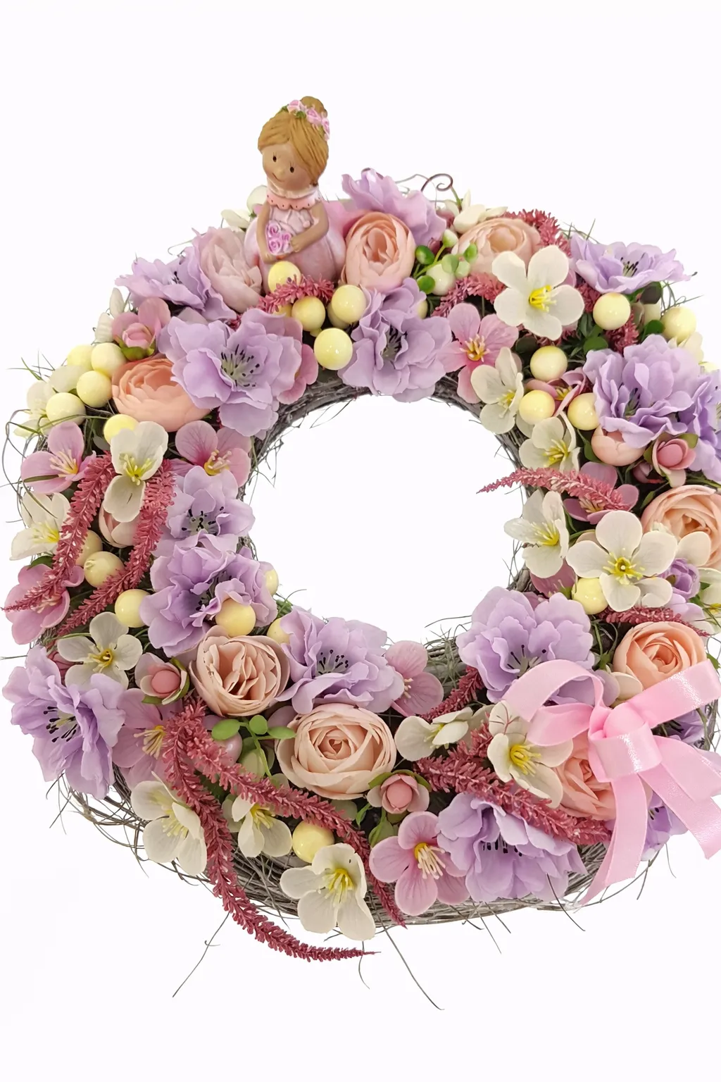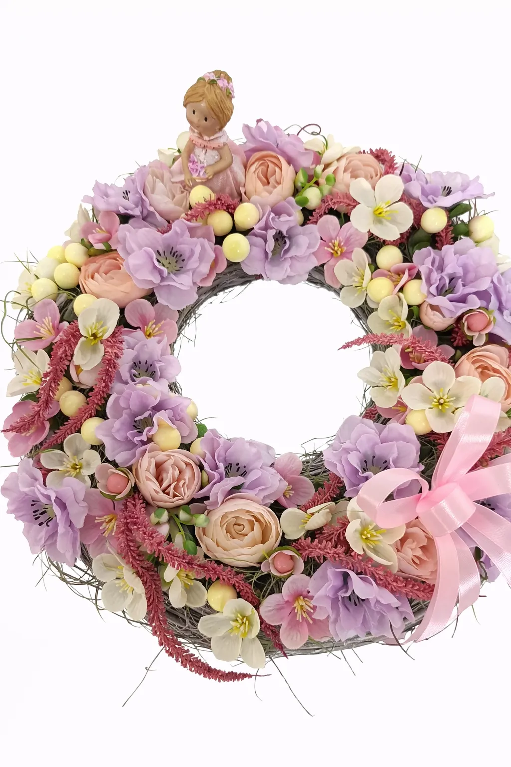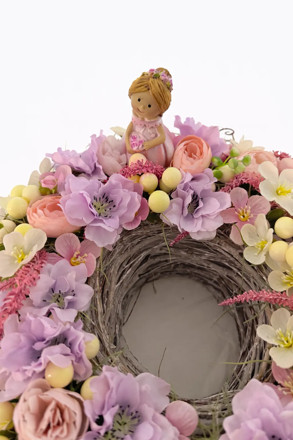 Aranjamentul este completat de o fundiță delicată și de o figurină fetiță, simbol al bucuriei, purității și al începuturilor, care pare să întâmpine primăvara cu gingășie. Datorită florilor artificiale de calitate superioară, acest aranjament își păstrează frumusețea în timp, fiind ideal atât ca decor de sezon, cât și ca piesă decorativă de lungă durată.