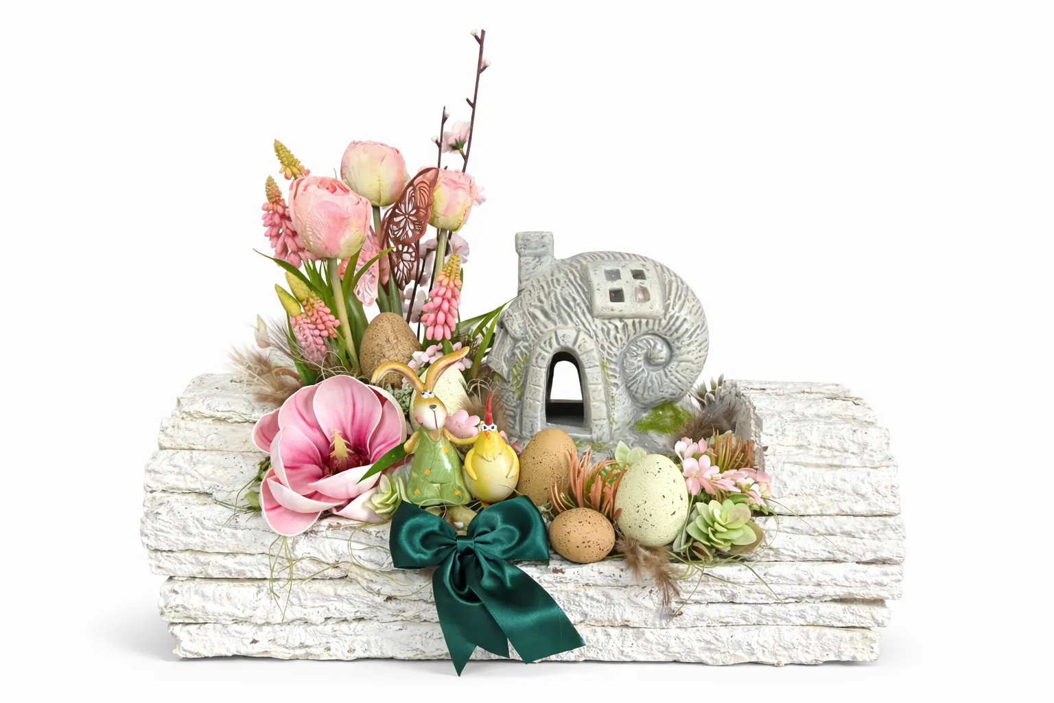 - ouă decorative de Paști, integrate subtil în compoziție
