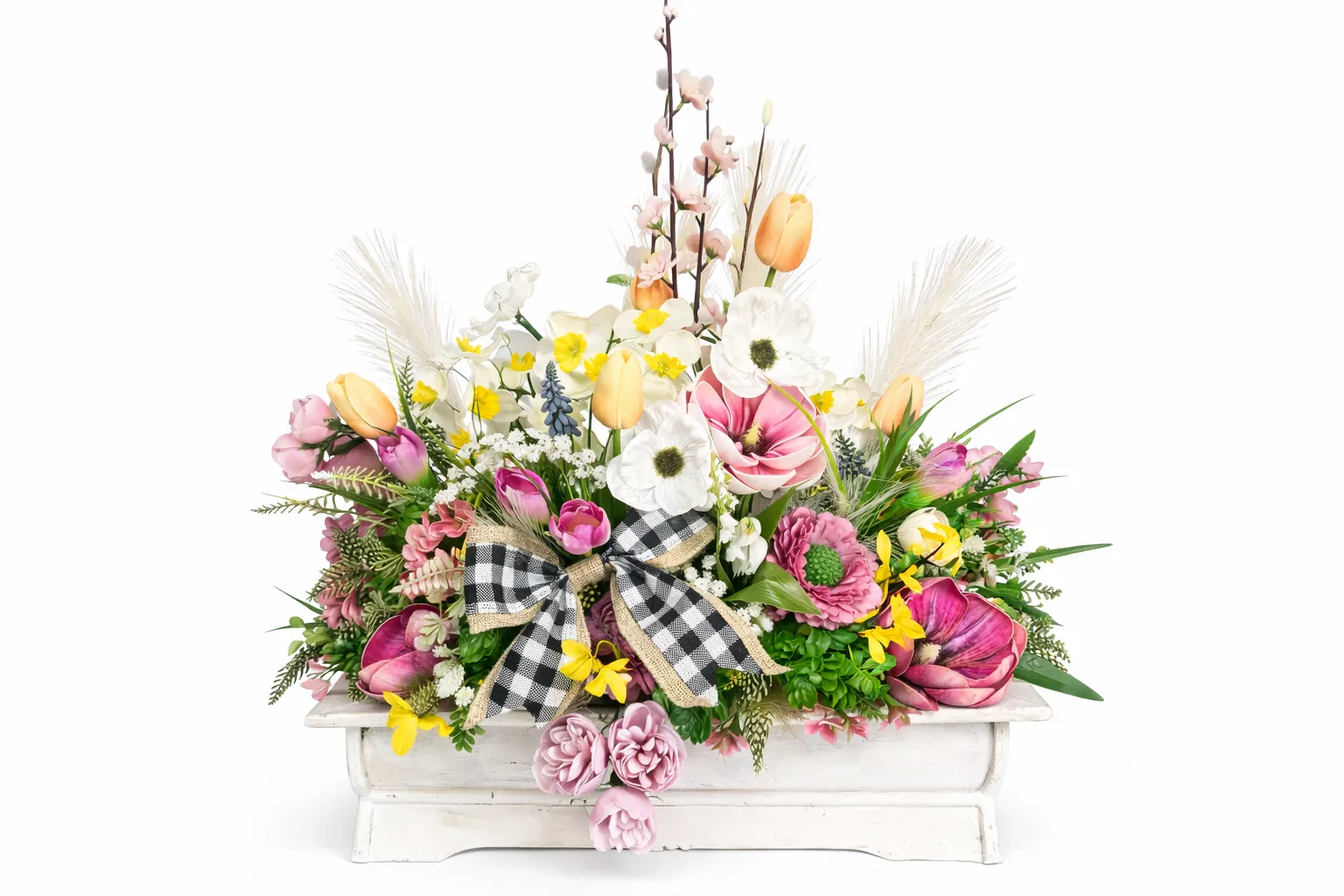 Acest aranjament floral de primăvară impresionează prin volum, diversitate și armonia culorilor, fiind o piesă decorativă statement, perfectă pentru orice spațiu elegant.