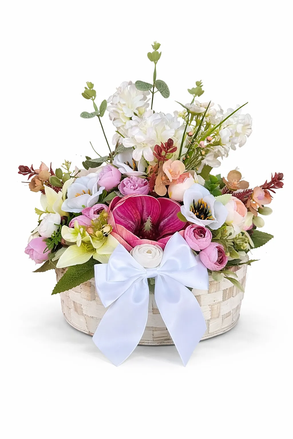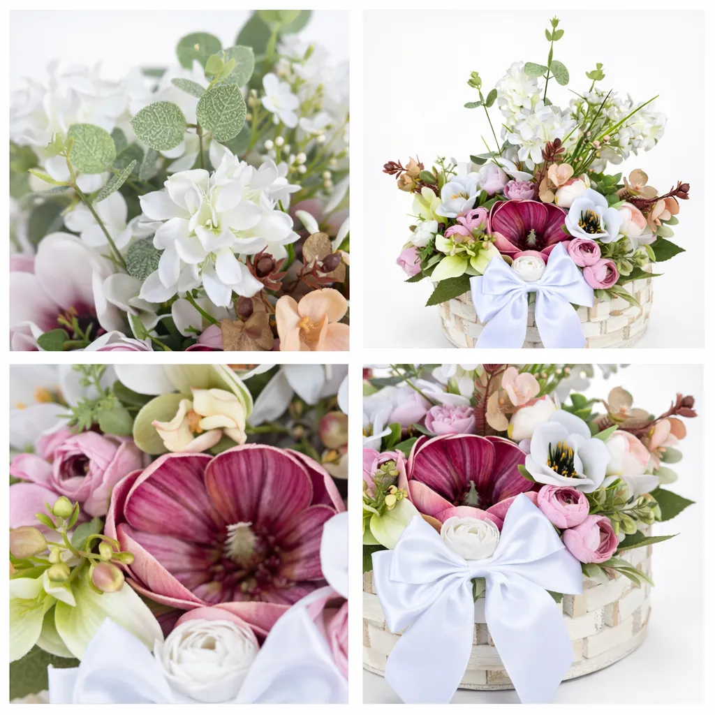 Paleta cromatică este una delicată, specifică sezonului primăvară-vară: alb pur, roz pastel, lila, crem și accente subtile de verde natural. Texturile variază de la petale fine și catifelate, la elemente ușor structurate, completate de coșul din lemn cu aspect rustic și funda satinată elegantă.