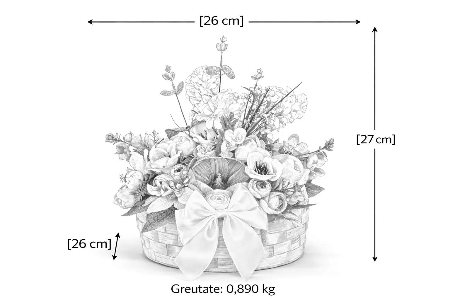 Compoziția florală este bogată și armonioasă, combinând flori atent alese precum magnolii, zambile, ranunculus și anemone, completate de verdeață fină și accente de eucalipt. Florile sunt dispuse într-un stil aerisit, cu volum echilibrat și focalizare centrală, oferind un aspect luxuriant, dar rafinat.