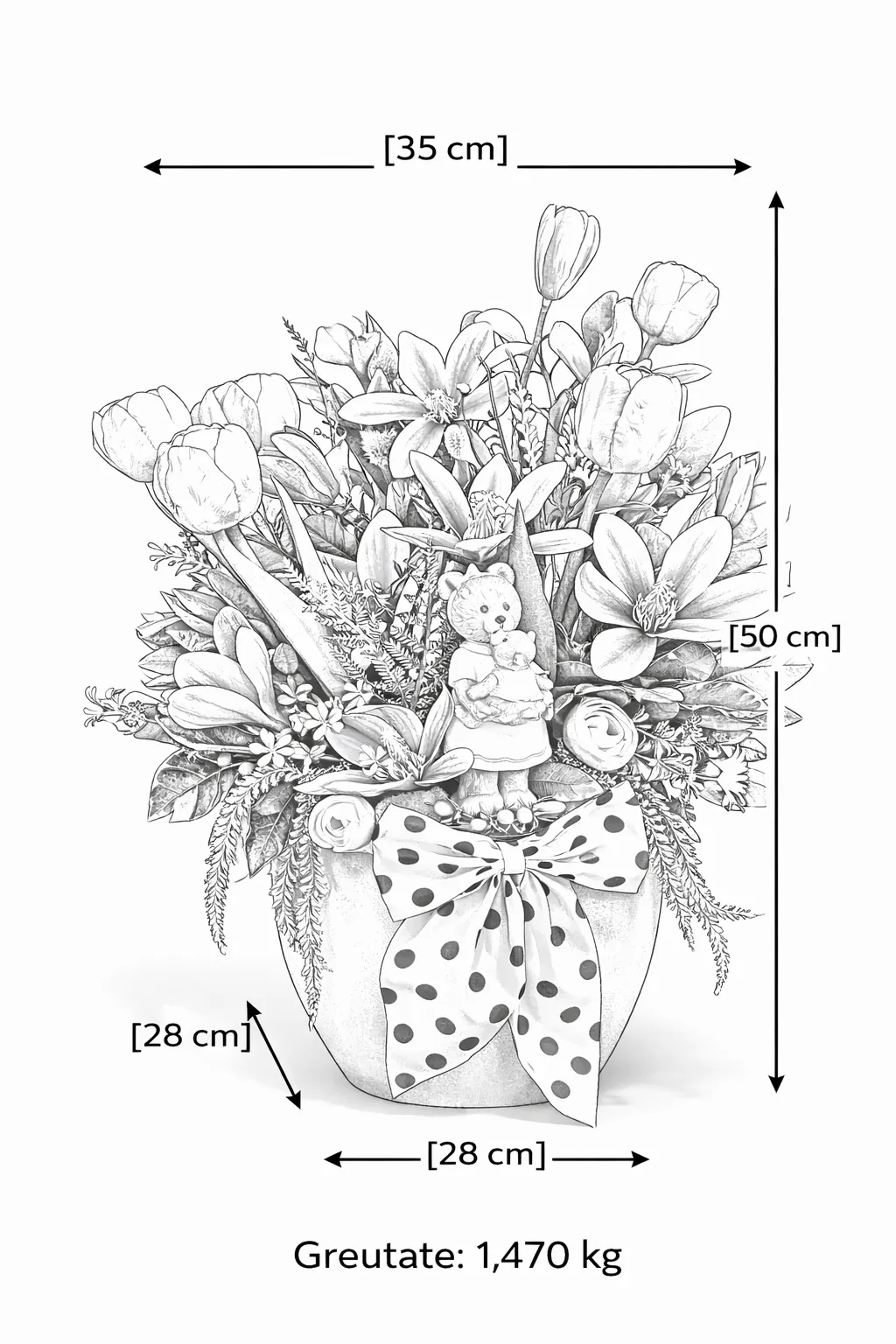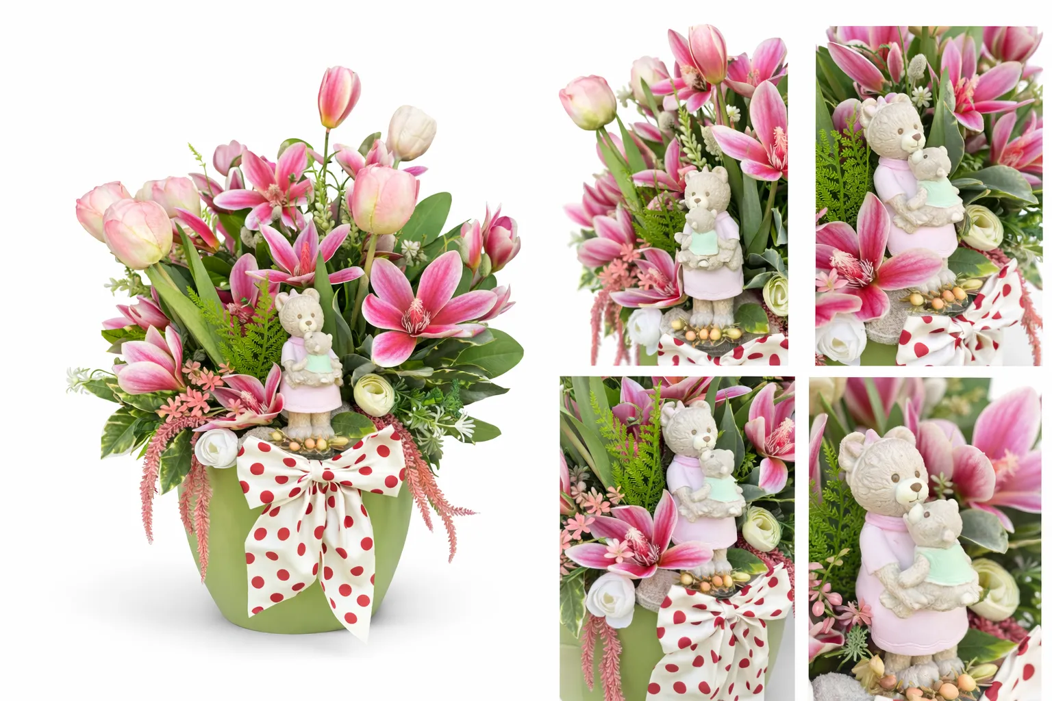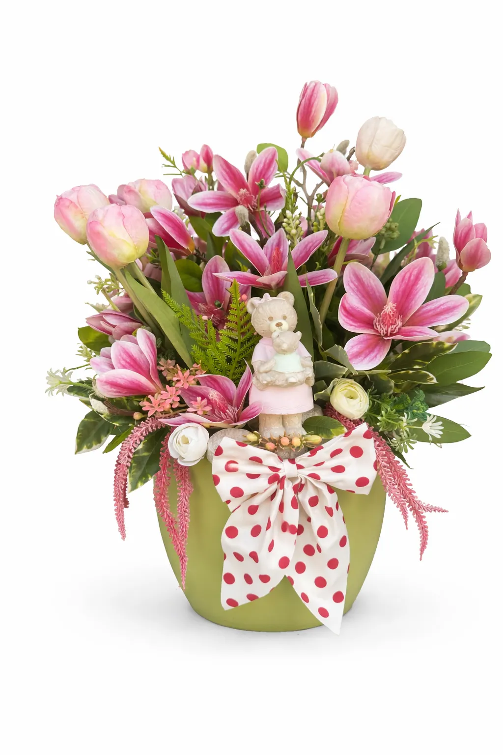 Elementul central este reprezentat de o figurină ceramică adorabilă, ilustrând o ursoaică cu puiul ei, simbol al iubirii necondiționate și al legăturii profunde dintre mamă și copil. Aranjamentul este așezat într-un ghiveci ceramic stabil, decorat cu o fundă textilă cu buline, ce adaugă un plus de farmec și personalitate.
