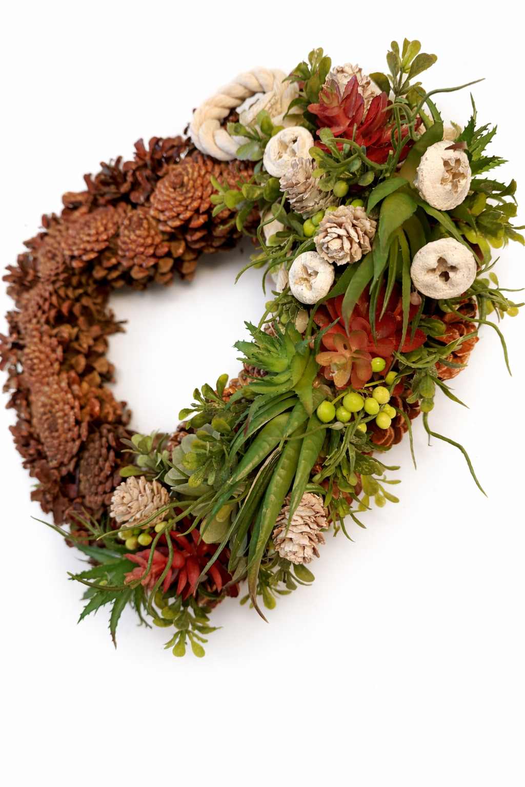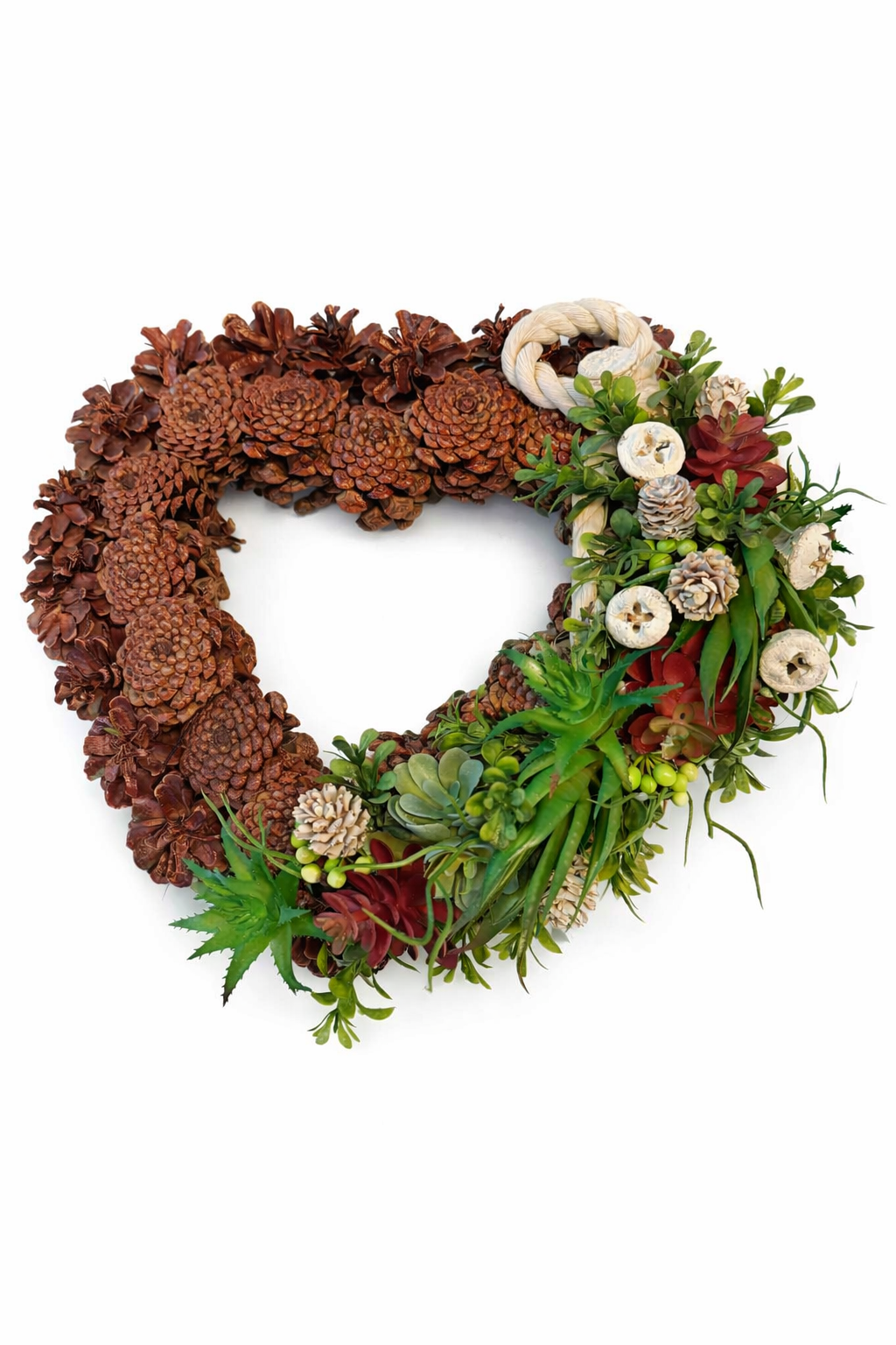 Această coroană comemorativă în formă de inimă este o piesă decorativă deosebită, creată pentru a exprima respect, iubire și reculegere într-un mod elegant și contemporan. Realizată din conuri naturale atent selecționate, completate de plante artificiale suculente premium cu aspect extrem de realist, coroana îmbină armonios naturalețea cu rafinamentul decorativ.