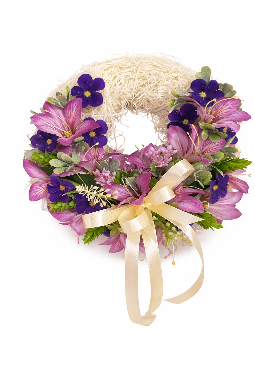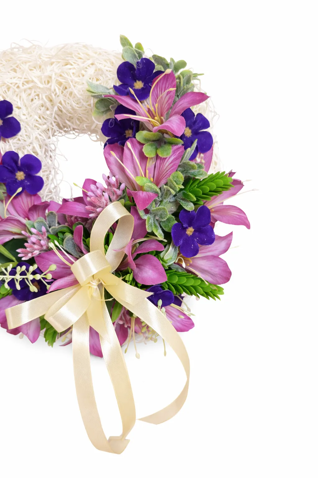 Această coroniță de ușă cu flori artificiale, creată într-un stil minimalist, este alegerea ideală pentru cei care apreciază eleganța subtilă și decorul echilibrat. Baza este decorată armonios cu alstroemeria artificială în tonuri fine de roz și mov, completată de violete de Parma artificiale, care adaugă profunzime și un contrast delicat.