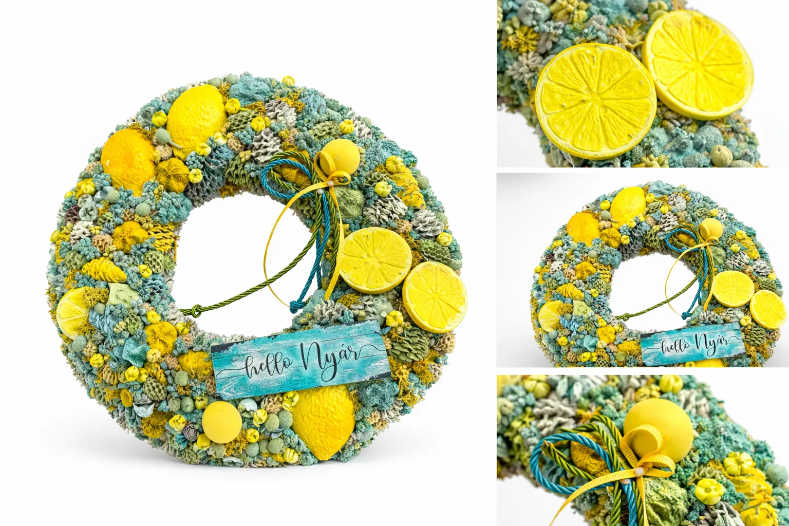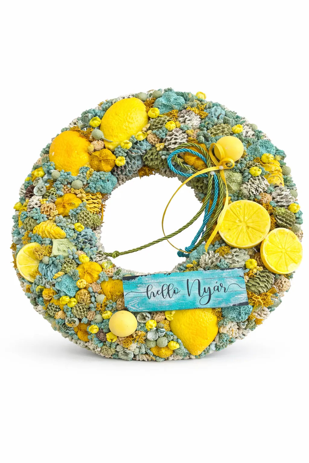 Această coroniță decorativă de vară impresionează printr-un design proaspăt, vibrant și plin de energie, inspirat din prospețimea citricelor și culorile senine ale sezonului cald.