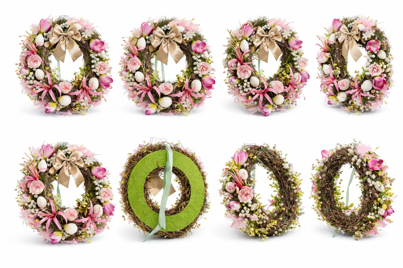 - Elemente decorative: ouă, pene roz, elemente uscate