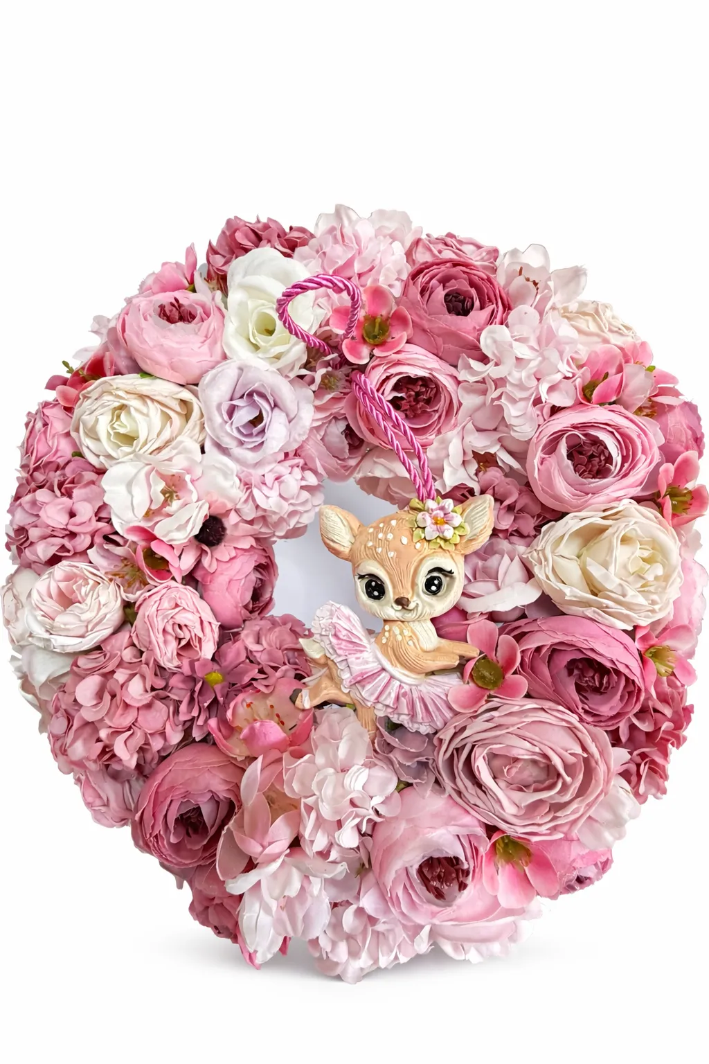 Realizată din flori artificiale premium, coronița oferă un aspect natural și luxuriant, datorită compoziției dense și atent echilibrate. Aranjamentul include: