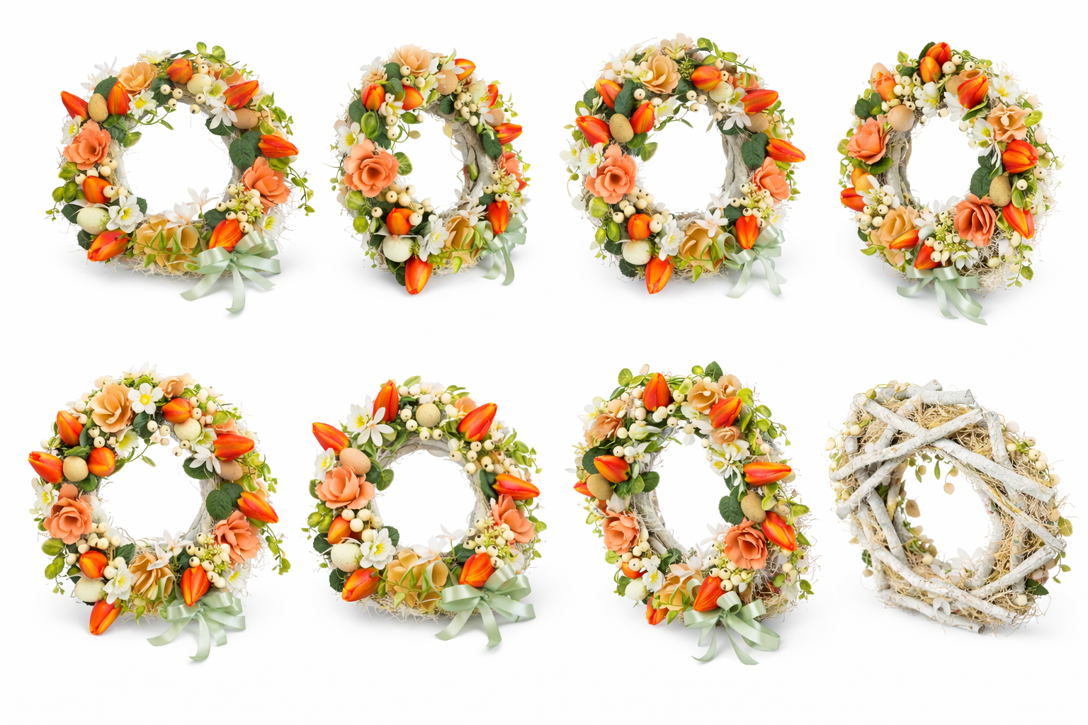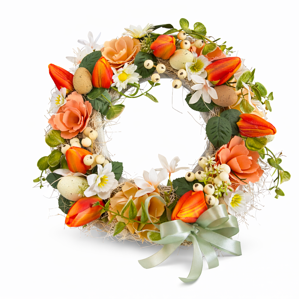 Paleta de culori include tonuri calde de portocaliu, crem, alb și verde, creând o atmosferă luminoasă și primitoare. Această coroniță este ideală pentru decorul de primăvară și pentru perioada sărbătorilor pascale.