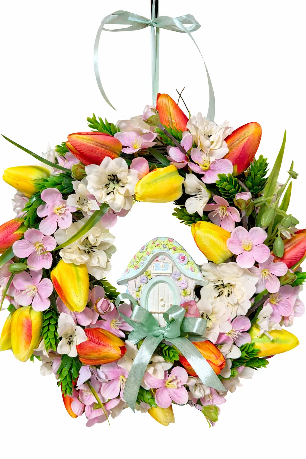 Punctul central al coroniței este reprezentat de o ușă ceramică decorativă, un detaliu unic și plin de simbolism. Aceasta pare să ne invite într-un tărâm de poveste, unde totul este viu colorat, armonios și plin de optimism. Panglica decorativă completează ansamblul, oferind un finisaj elegant și coerent.