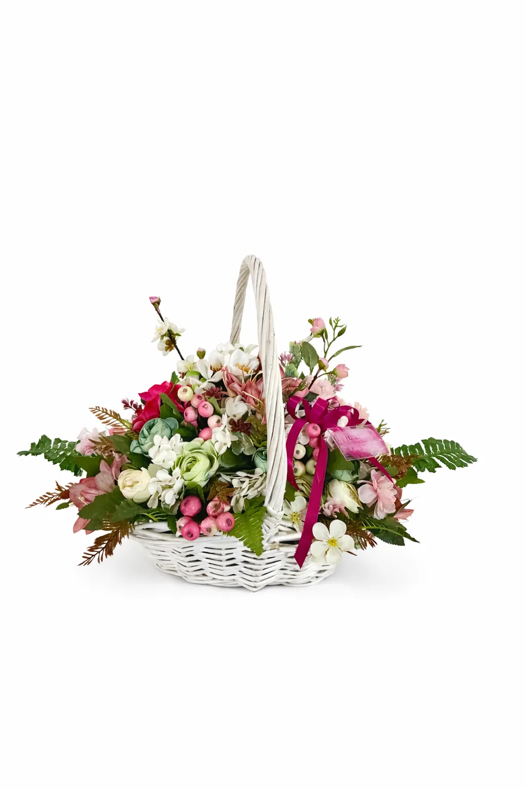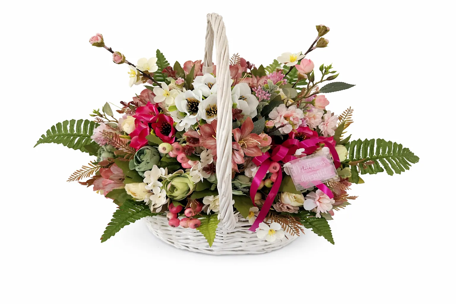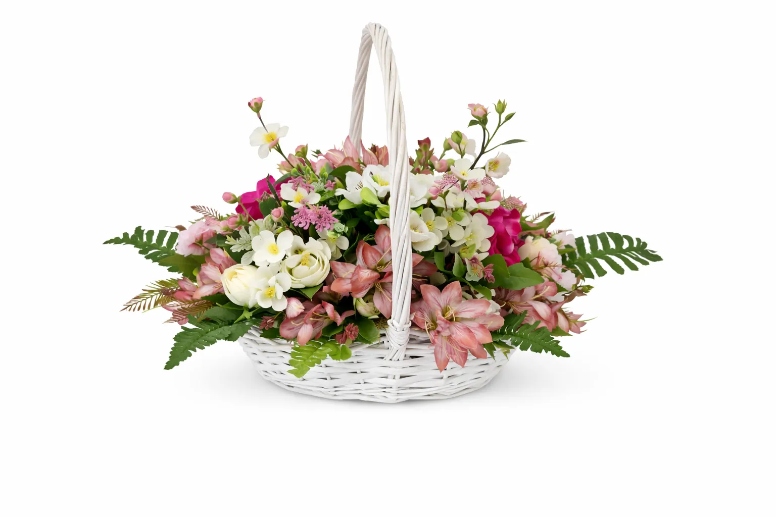 Acest coș floral premium de primăvară este o creație decorativă deosebită, concepută pentru a aduce un plus de eleganță și prospețime oricărui spațiu. Aranjamentul este realizat manual, într-un coș din ratan alb, cu design clasic și finisaj delicat, care pune în valoare bogăția florilor și armonia cromatică.