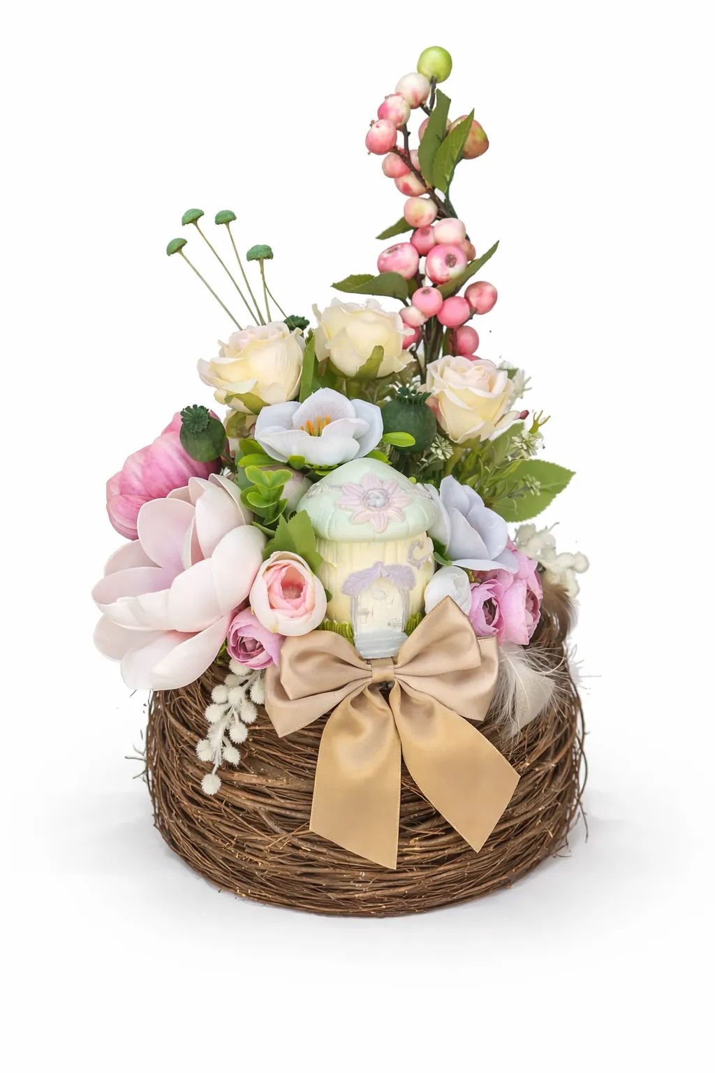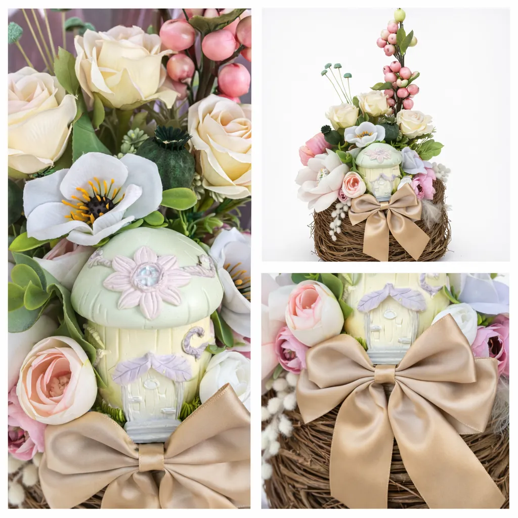Elementul central este o căsuță decorativă din ceramică, cu detalii fine și un design inspirat din universul feeric, ce transformă întregul aranjament într-o piesă unică și memorabilă.