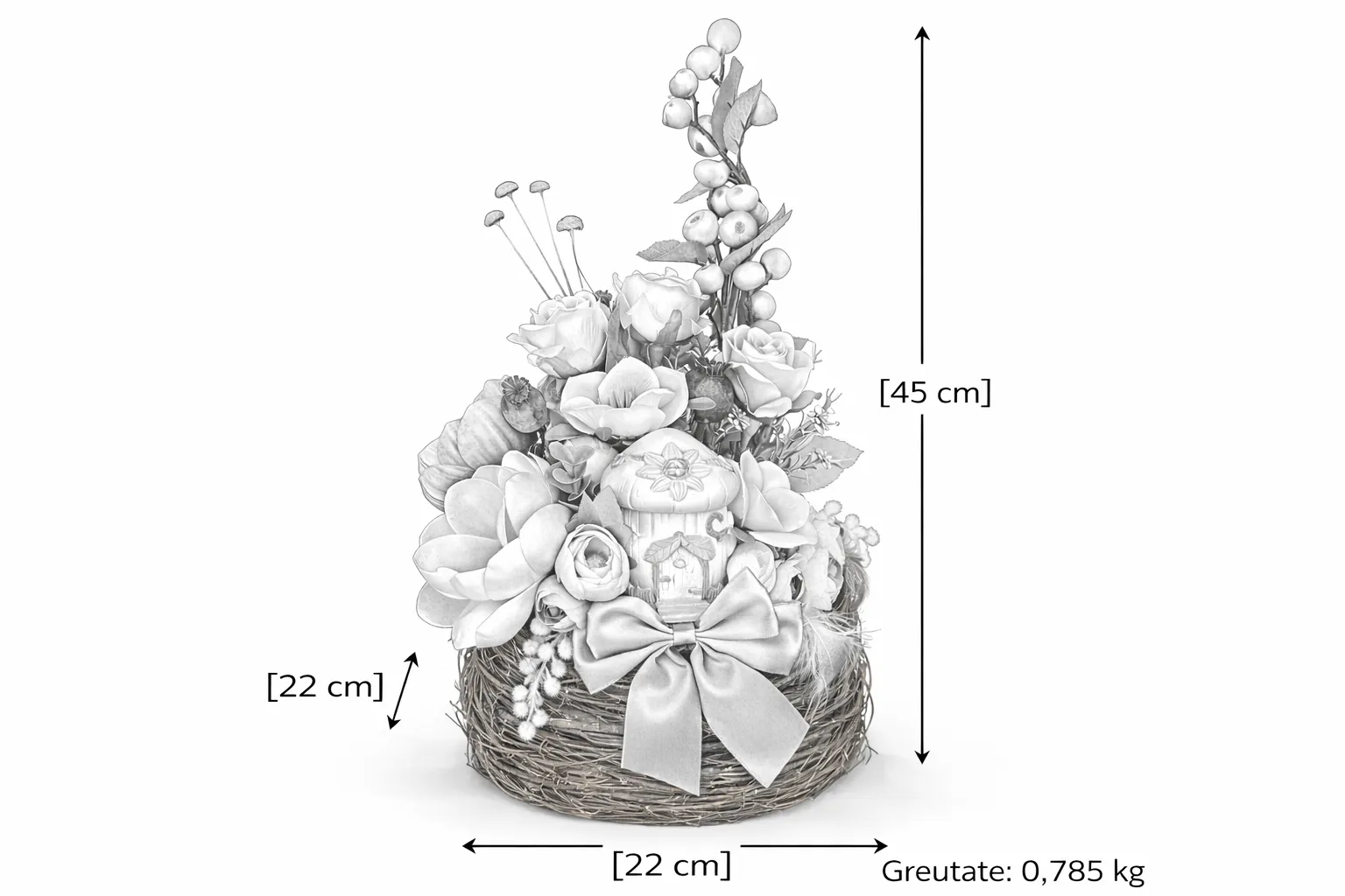 Aranjamentul este compus din flori artificiale premium: ranunculus, anemone, trandafiri și magnolii, armonios combinate cu verdeață decorativă și accente naturale. Fiecare element este ales pentru a crea volum, profunzime și o estetică echilibrată.