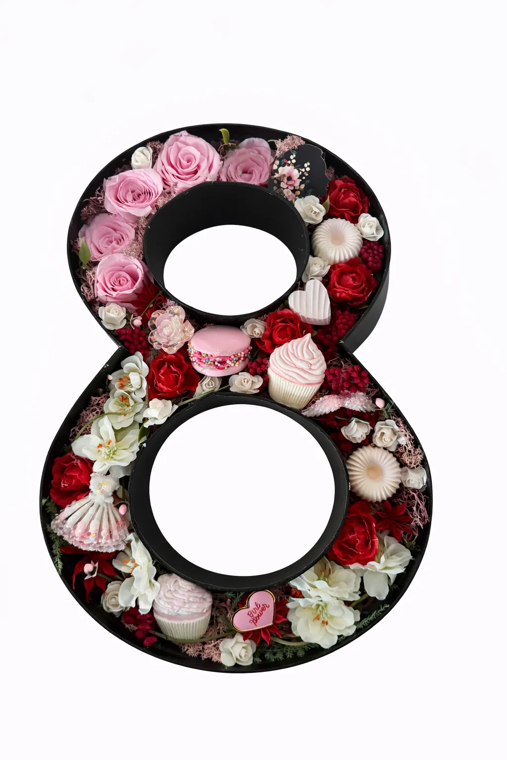 Flower box în formă de 8, realizat cu trandafiri criogenați roz, decorațiuni ceramice și din rășină (macarons, muffin, bezele, inimioare și element „Girl Power”), ideal pentru cadouri speciale și elegante.