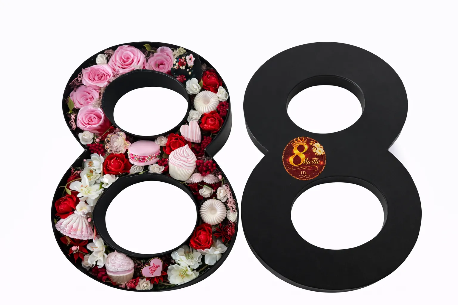 Acest flower box în formă de 8 este un aranjament deosebit, creat pentru a impresiona prin atenția la detalii, armonia culorilor și simbolistica sa elegantă. Forma cifrei 8 sugerează infinitul, feminitatea și echilibrul, transformând acest produs într-un cadou cu adevărat memorabil.