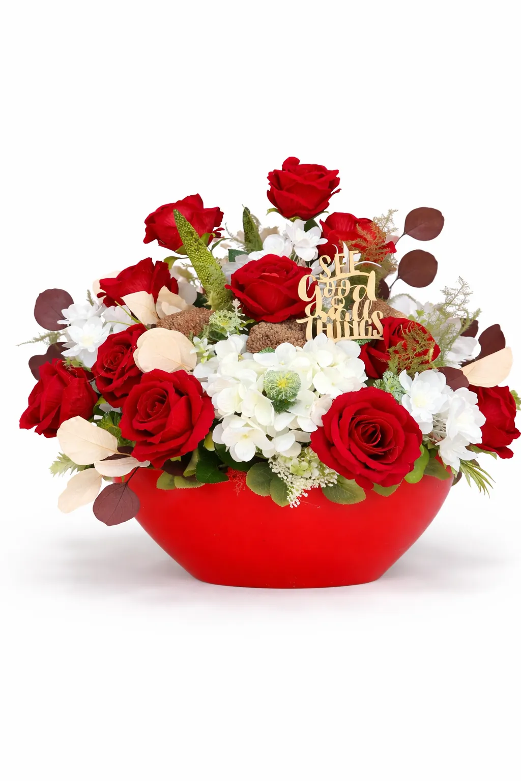Descoperă rafinamentul într-o compoziție florală deosebită, realizată într-un vas modern tip barcuță, de culoare roșu intens. Acest aranjament impresionează prin echilibrul perfect între eleganță și naturalețe, având în centrul atenției trandafiri roșii premium, simbol al iubirii și pasiunii, completați de hortensie albă delicată și flori decorative atent alese.