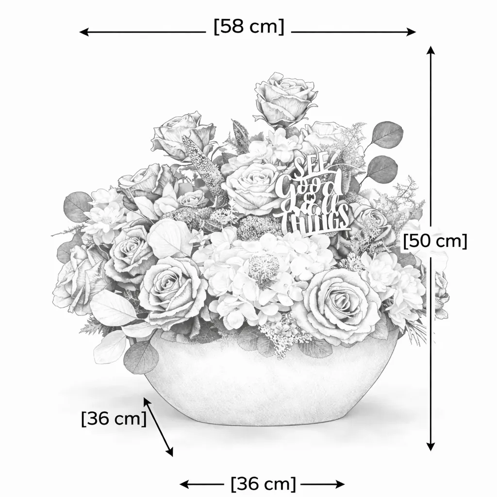 Texturile variate și verdeața fină creează volum și profunzime, iar elementul decorativ „See good in all things” adaugă un mesaj pozitiv și inspirațional. Designul este gândit pentru a atrage privirea din orice unghi, fiind ideal atât pentru decor interior, cât și pentru a fi oferit cadou în momente speciale.