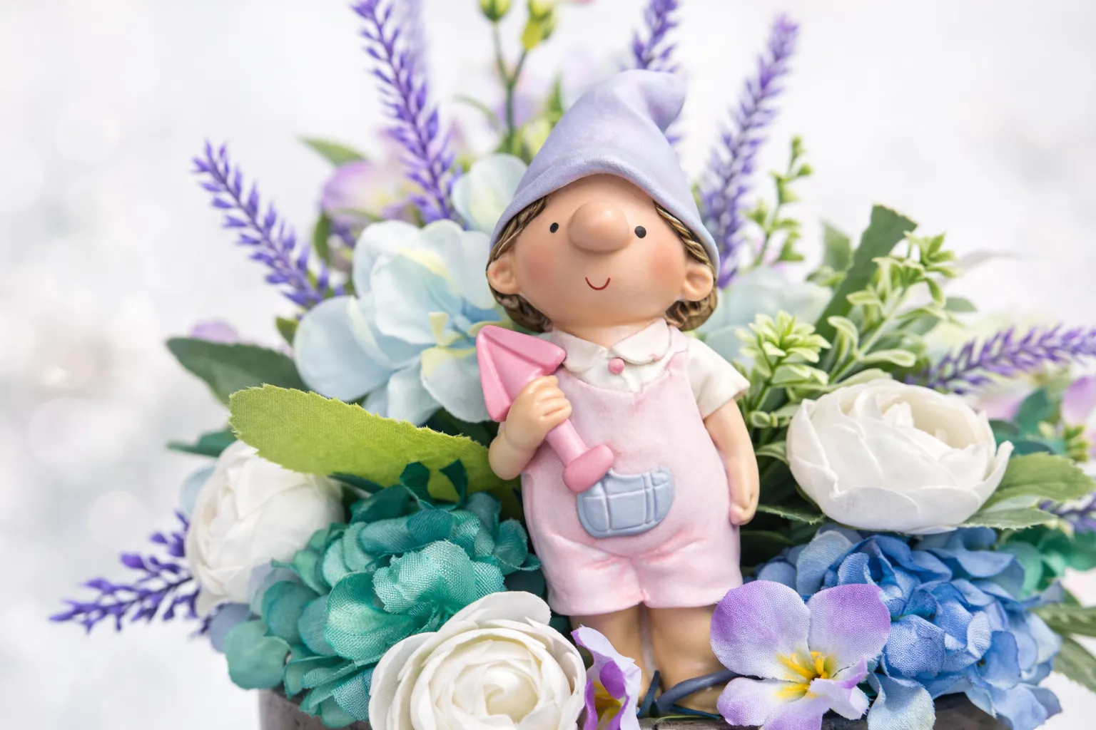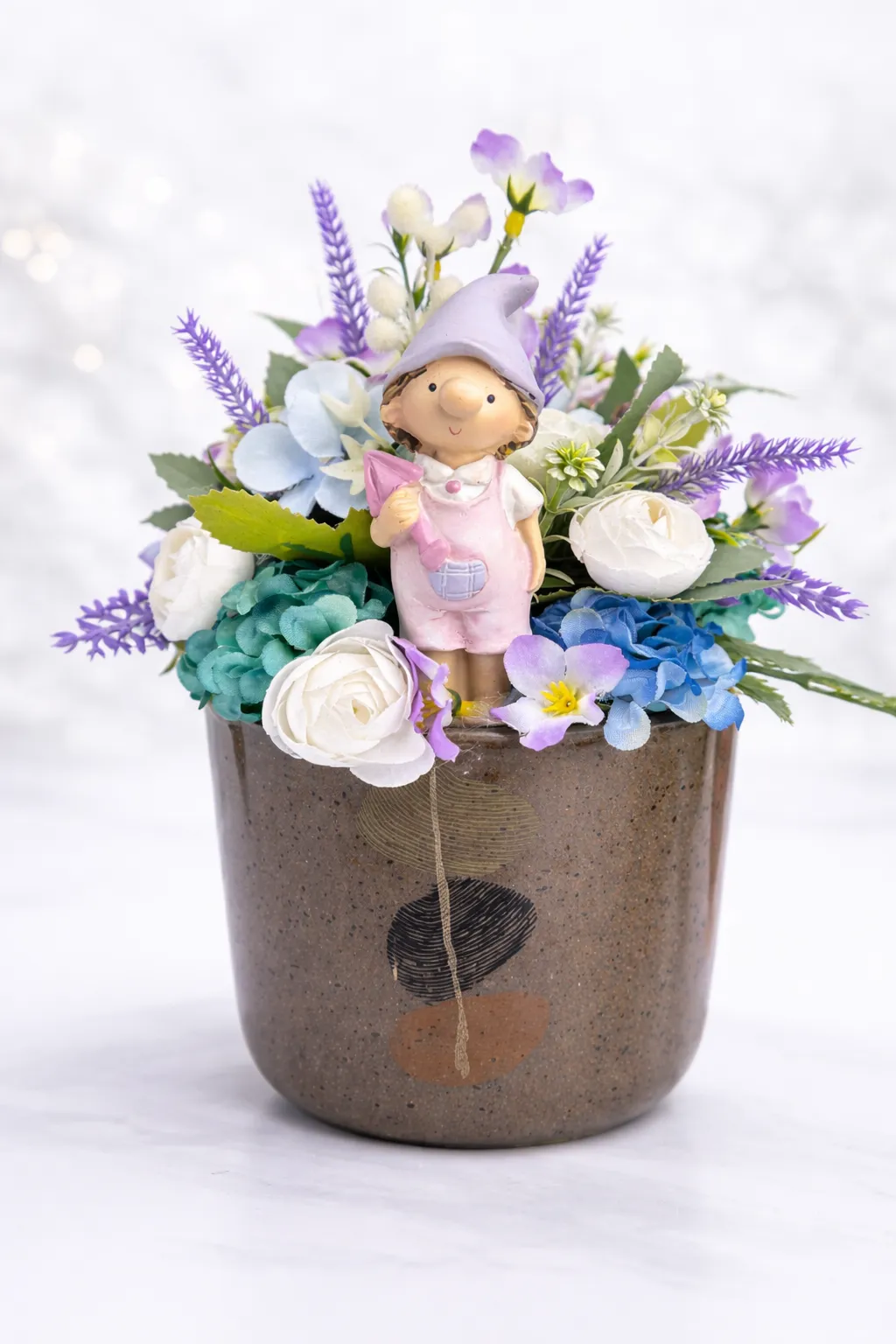 Aranjament floral decorativ unicat, realizat manual, în vas ceramic premium, cu flori artificiale de calitate superioară (hortensie, lavandă, ranunculus) și figurină decorativă băiețel. Ideal pentru cadouri elegante sau decor rafinat.