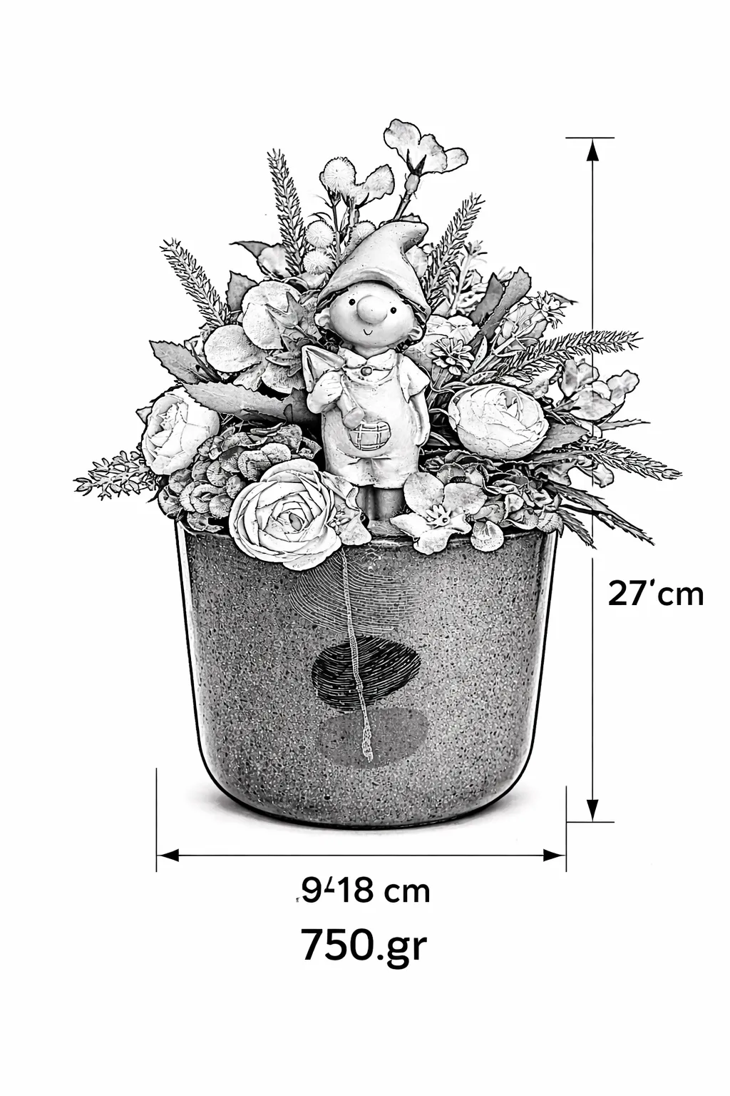 În centrul compoziției se află o figurină ceramică în formă de băiețel, care adaugă personalitate și un aer jucăuș, completând perfect designul floral.