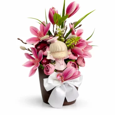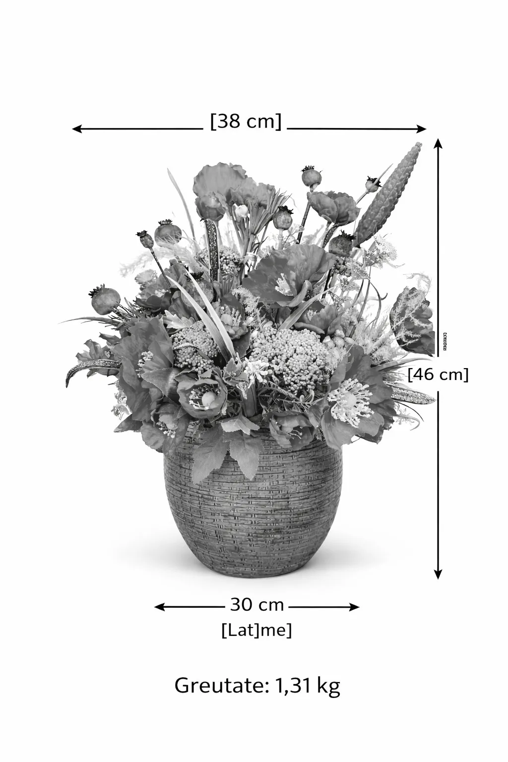 Fiecare detaliu este atent ales pentru a oferi un aspect autentic și rafinat, de la florile bogate până la accentele decorative și verdeața subtilă. Compoziția este realizată din flori artificiale premium, care își păstrează frumusețea în timp, fără întreținere.
