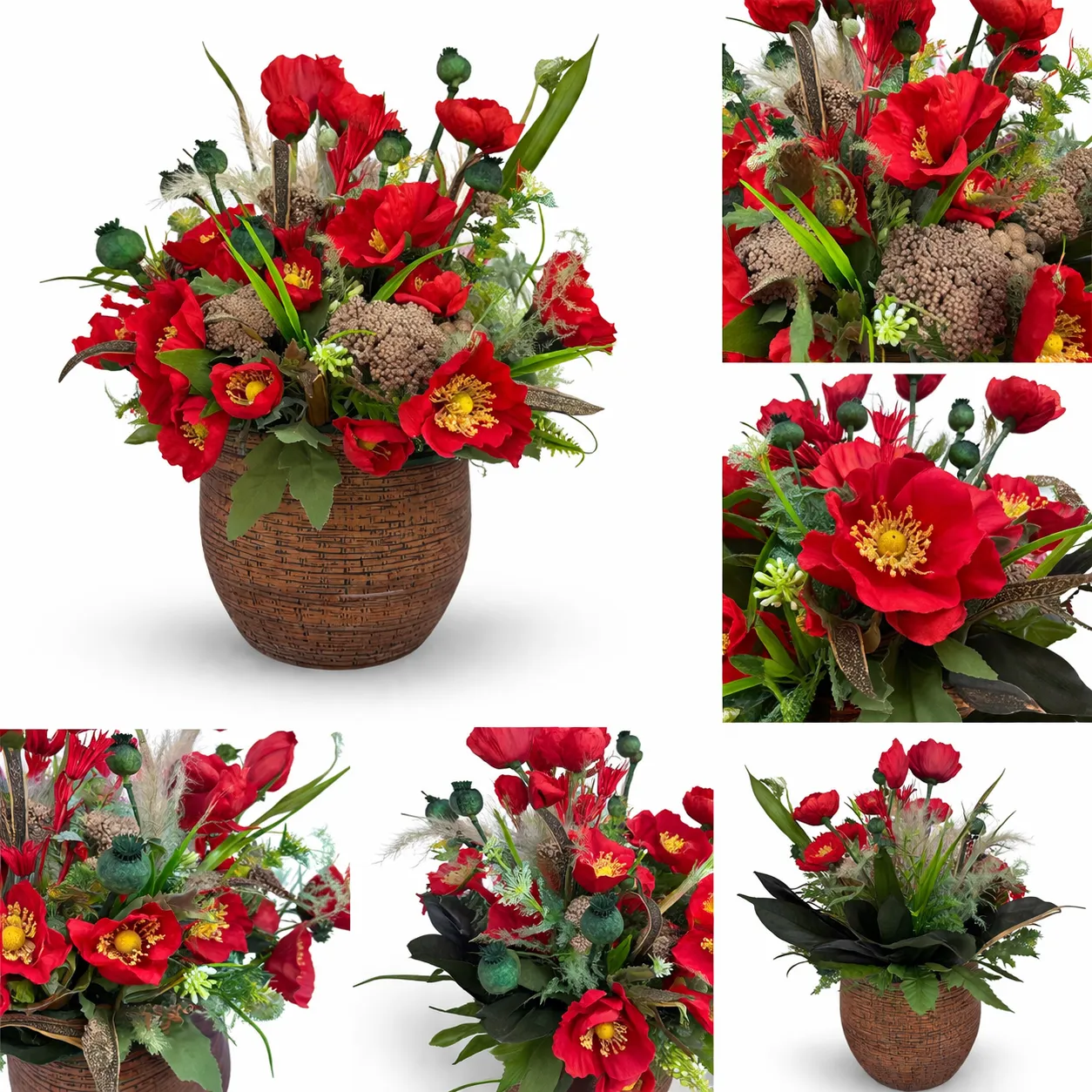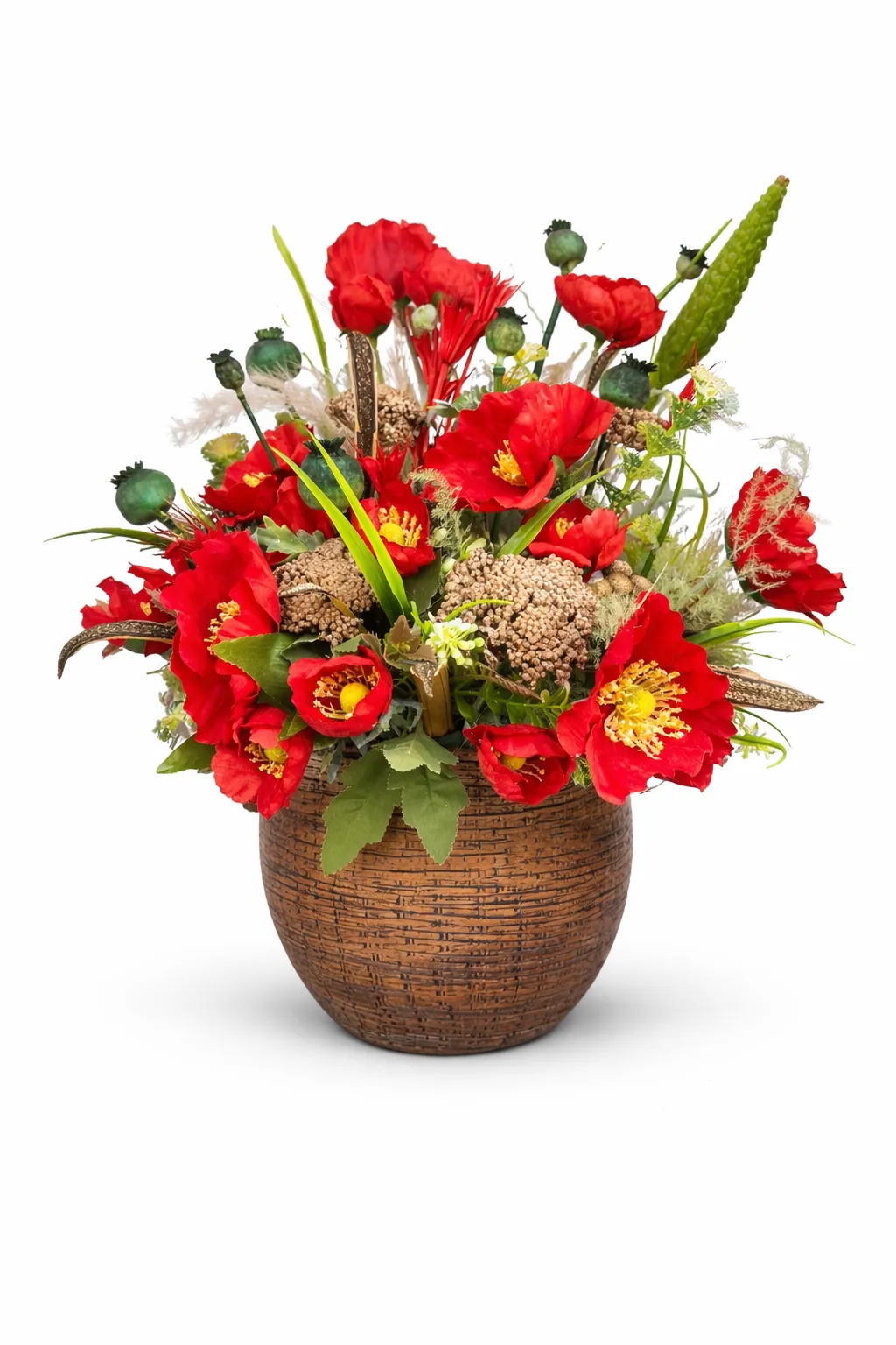 „Velvet Poppy” este un aranjament floral sofisticat, inspirat din frumusețea delicată și expresivă a macilor înfloriți. Nuanțele intense de roșu catifelat sunt completate armonios de elemente naturale și texturi fine, creând un decor echilibrat și elegant.